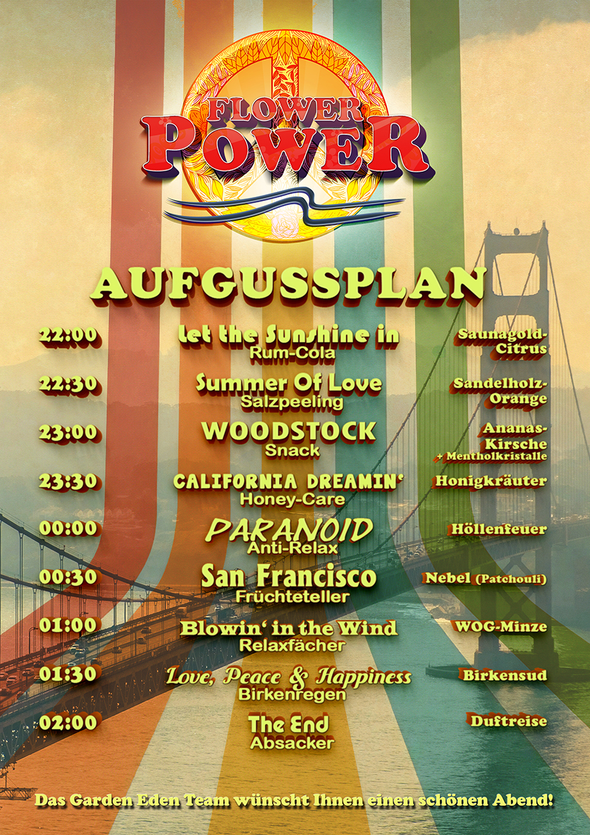 Zu Beginn um 22:00 Uhr lassen wir zu Let The Sunshine In die Sonne in unsere Herzen und genießen die sonnigsten Hits der 60er, reichen eine Rum-Cola und gießen Saunagold-Citrus auf. Dem Summer of Love widmen wir uns um 22:30 Uhr mit einem Salzpeeling zum Duft von Sandelholz-Orange, bevor wir um 23:00 Uhr bei Woodstock das berühmte Musikfestival bei einem Ananas-Kirsch-Aufguss mit Mentholkristallen Revue passieren lassen und dazu einen Snack genießen.