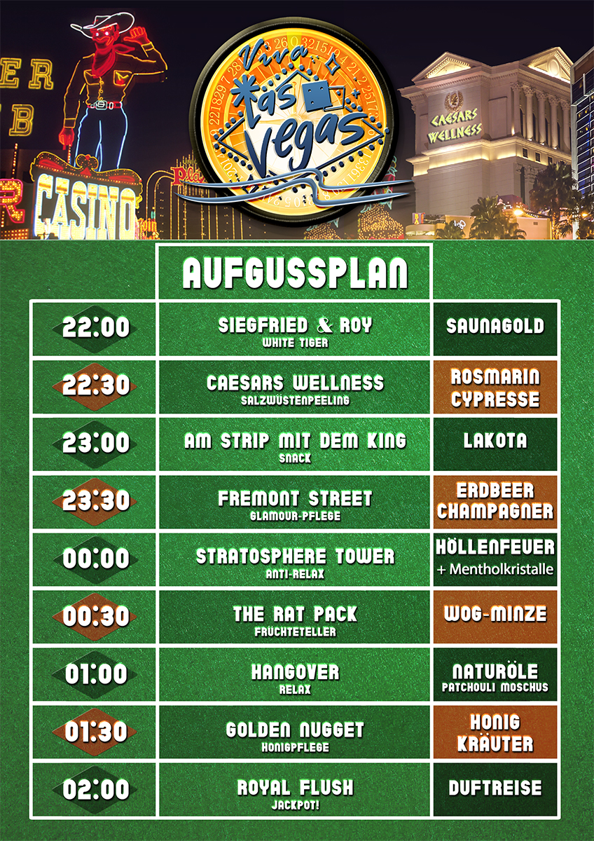 Das Rat Pack stattet uns um 00:30 Uhr mit einem Früchteteller einen Besuch ab und gießen WOG-Minze auf. Einen Hangover haben wir um 01:00 Uhr hoffentlich noch nicht, trotzdem entspannen wir uns beim Relax-Aufguss mit den Naturölen Pachouli-Moschus. Um 01:30 Uhr begeben wir uns ins Golden Nugget, um uns beim Duft von Honig-Kräutern eine Honigpflege zu gönnen, bevor wir zum Abschluss um 02:00 Uhr den Jackpot für unseren Royal Flush einstreichen und uns auf eine Duftreise nach Hause begeben.
